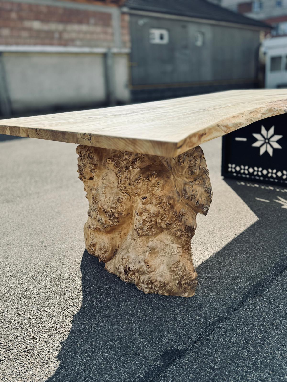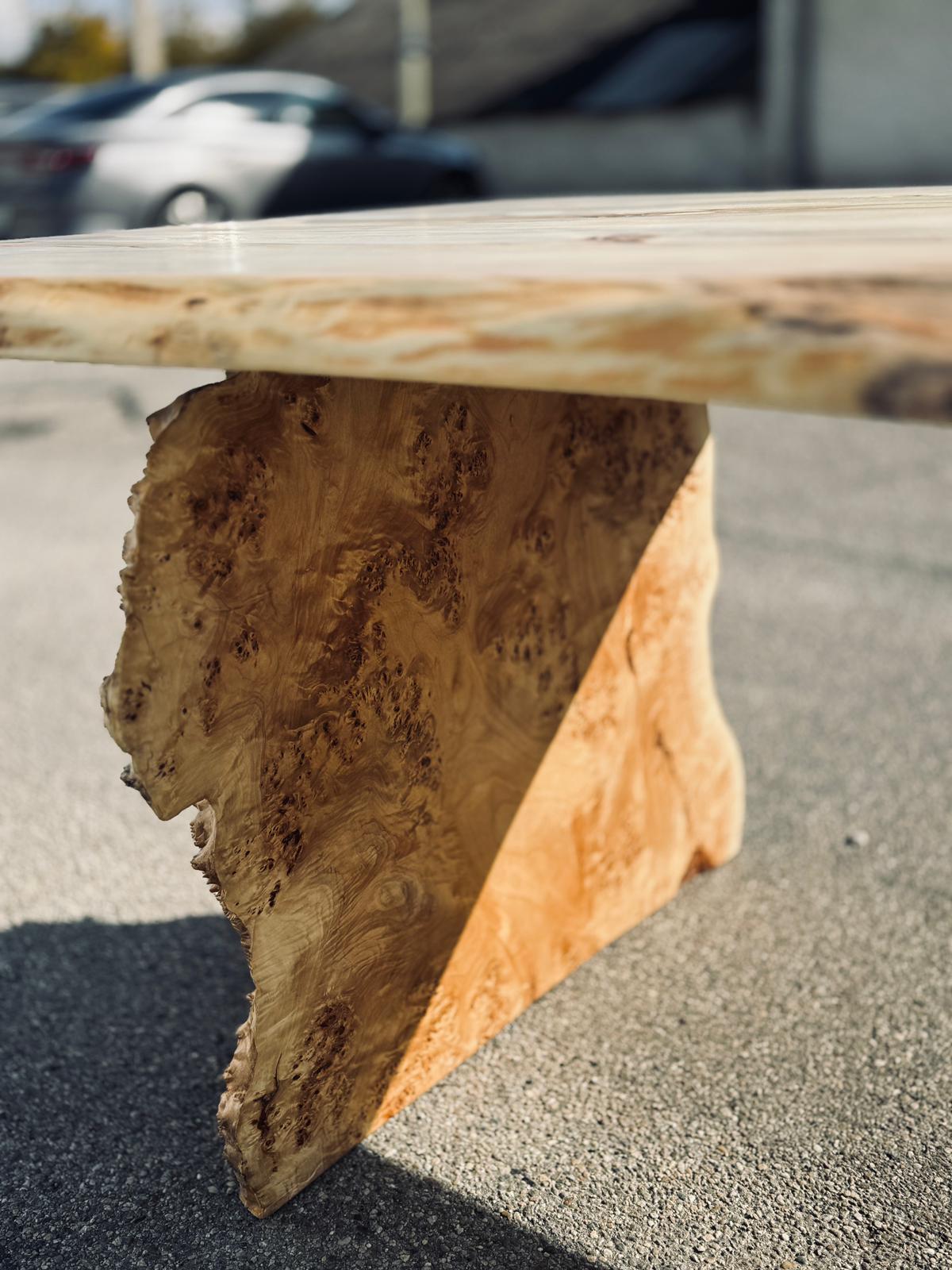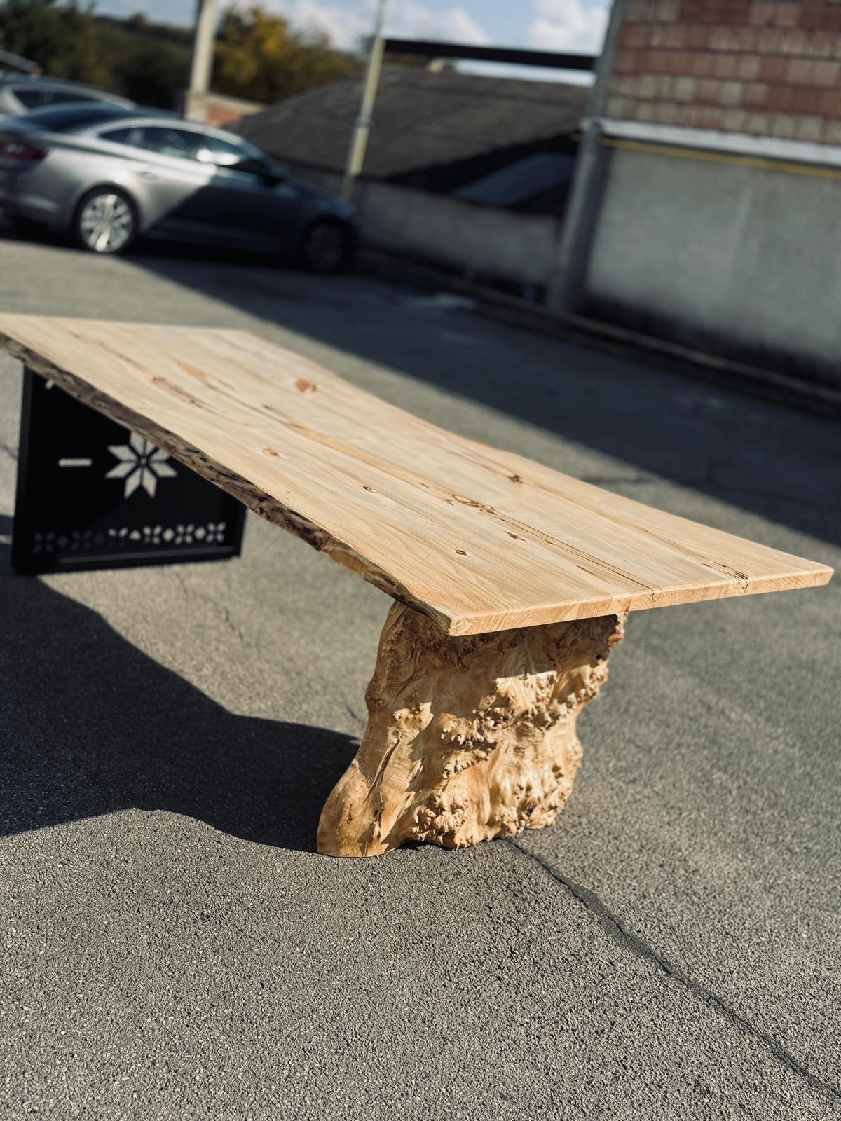 Masa din lemn masiv de plop si picior de plop bubos , finisat cu produse profesionale marca Heidelberg ProLignum , respectiv LED OIL WAX , ulei cu uscare pe baza de UV LED mat .