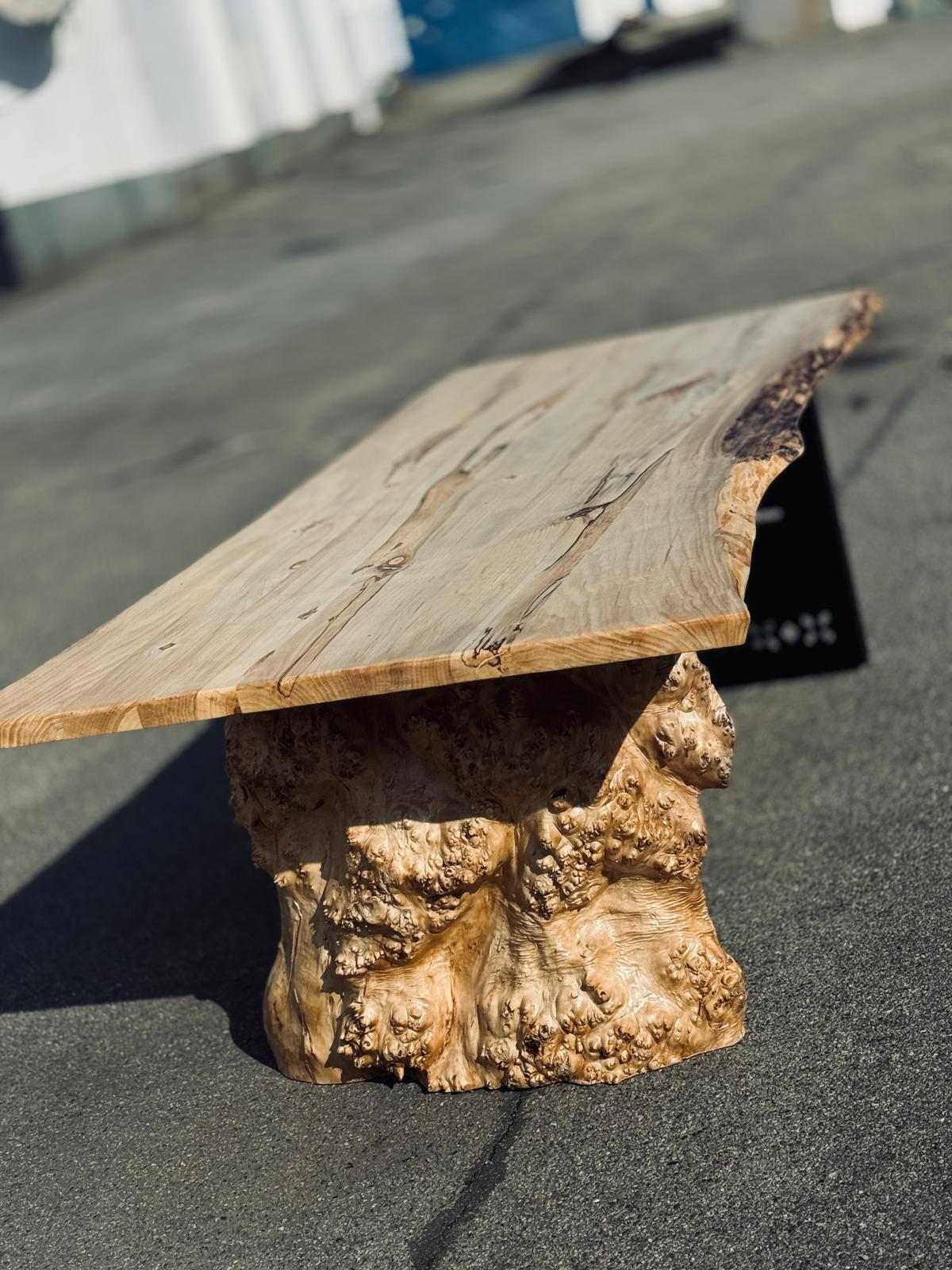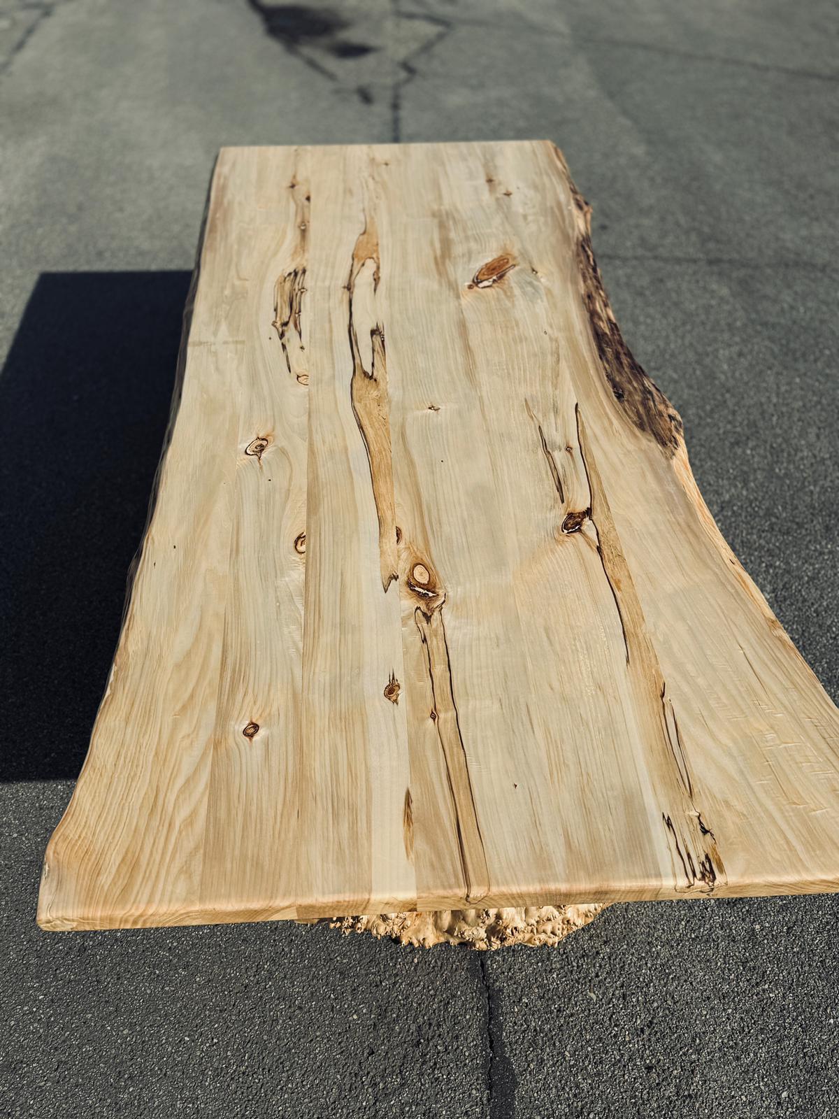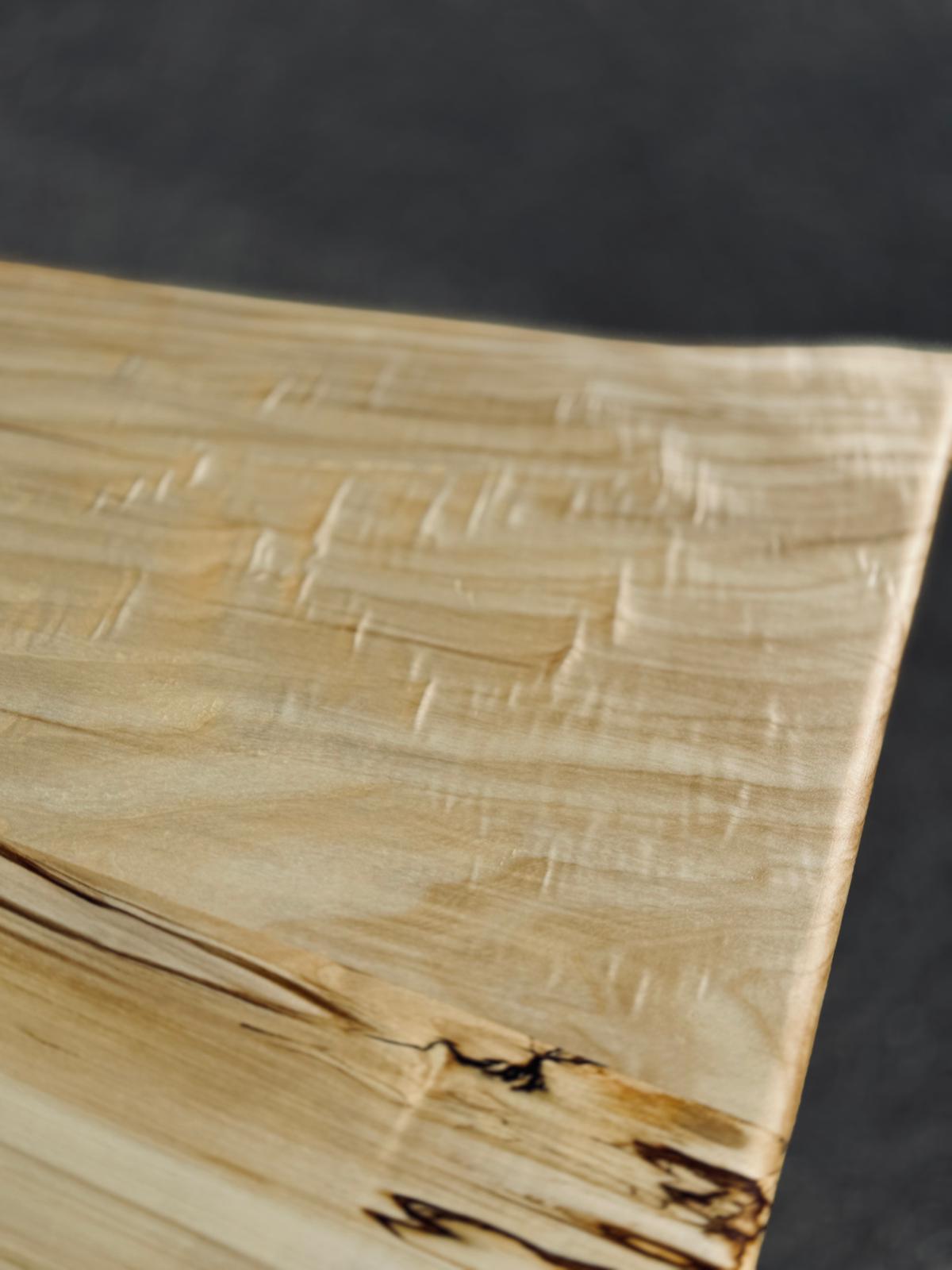 Masa din lemn masiv de plop si picior de plop bubos , finisat cu produse profesionale marca Heidelberg ProLignum , respectiv LED OIL WAX , ulei cu uscare pe baza de UV LED mat .