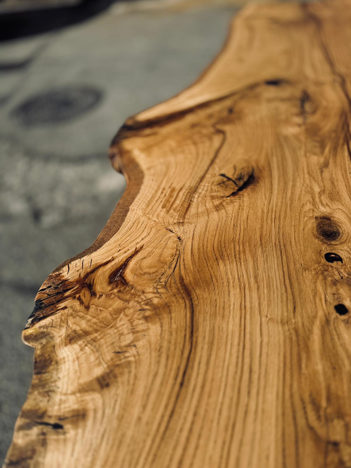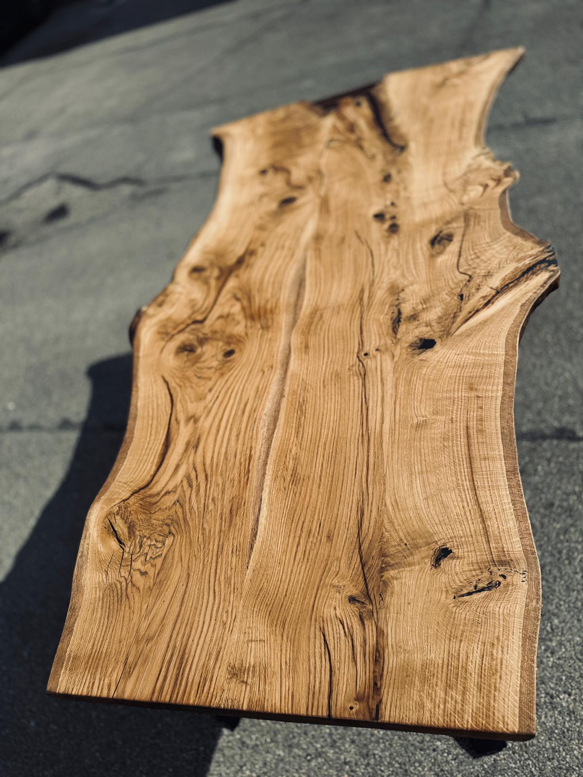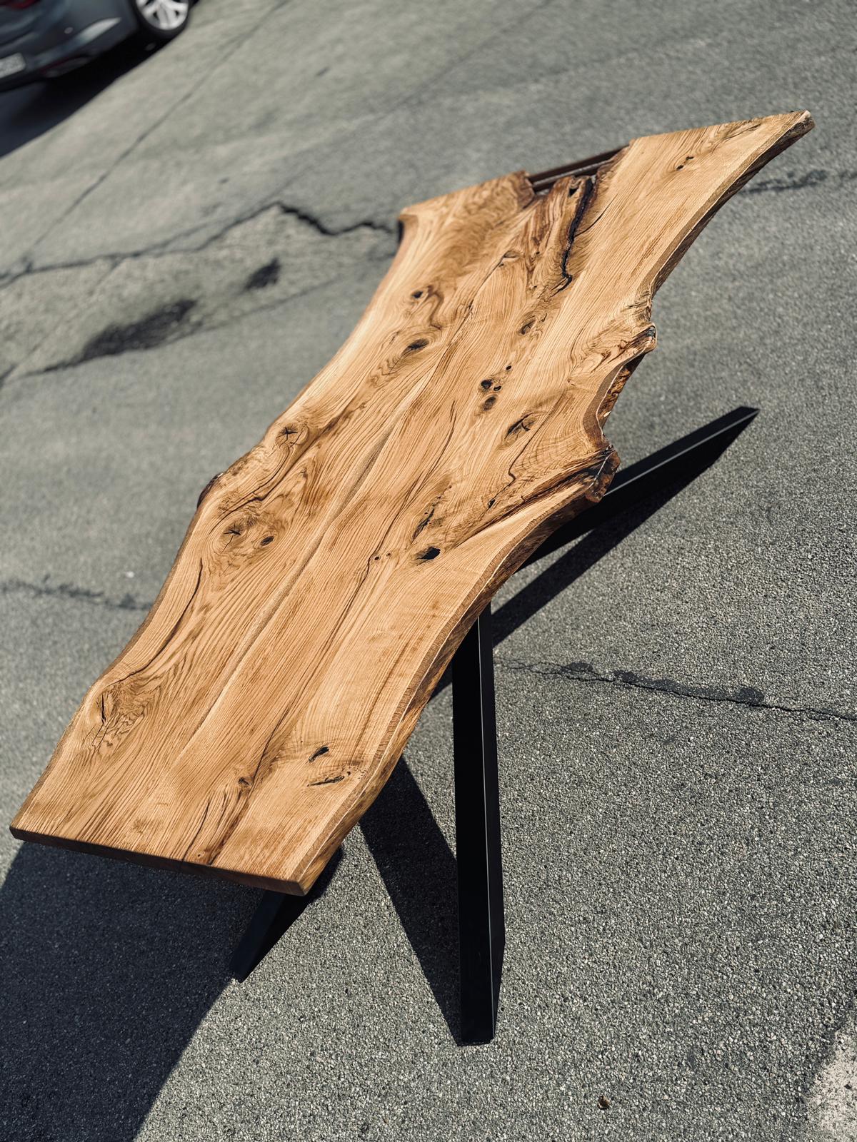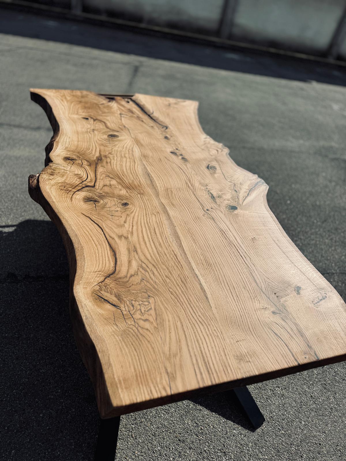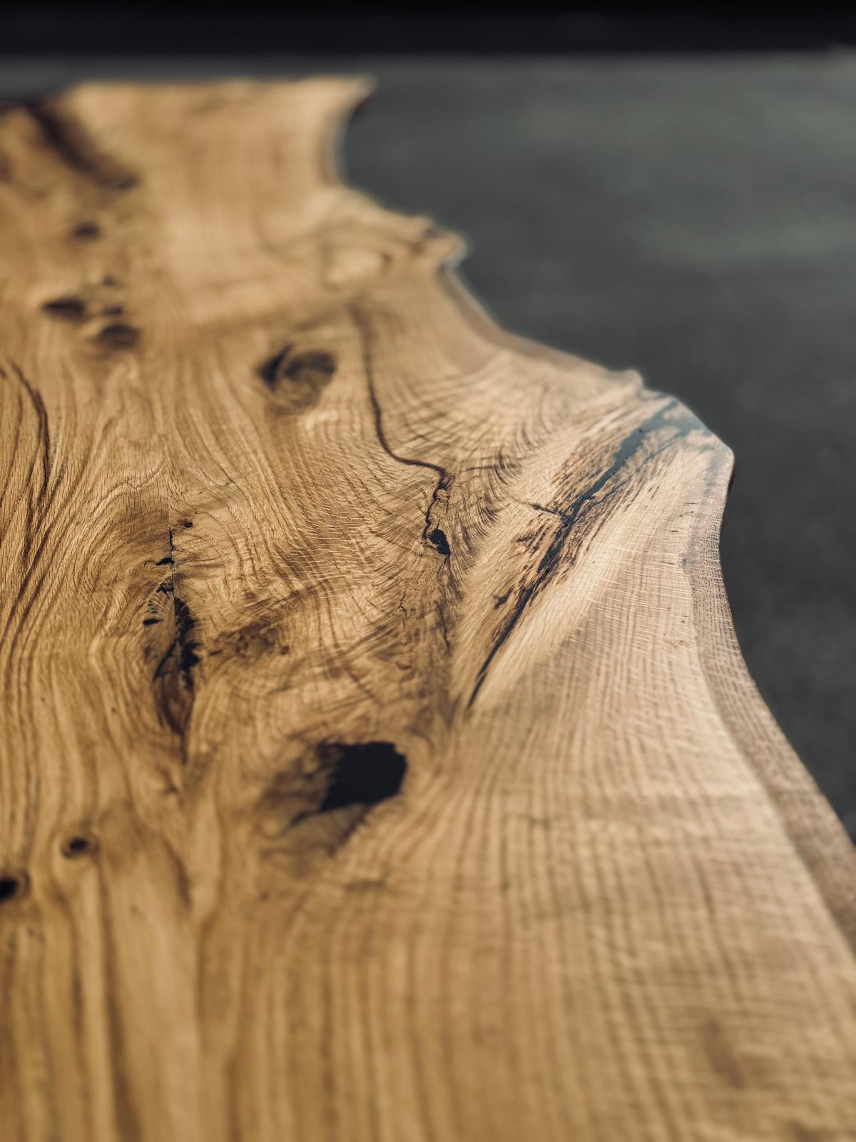 Masa din lemn de stejar , stil Bookmatch , finisata cu produse profesionale Heidelberg ProLignum , respectiv Hardwachs , o ceara dura food safe , foarte rezistenta la apa si produse chimice .
